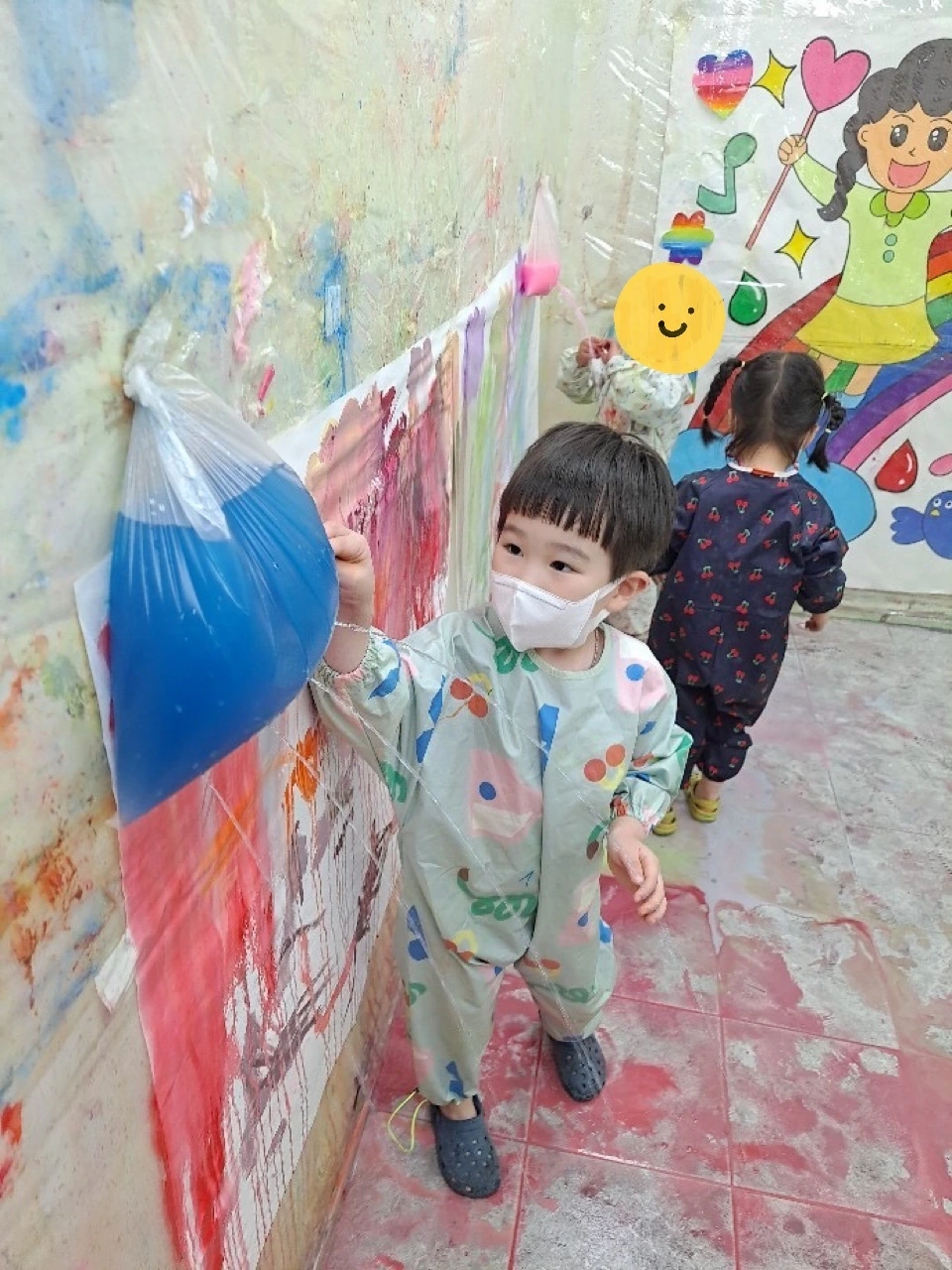 오늘은 1호 미술 수업이 있는 날입니다. 주제는 색 빗물. 속옷만 입은 상태로 전신 작업복을 입히고 슬리퍼를 신겨 들여보냈습니다.