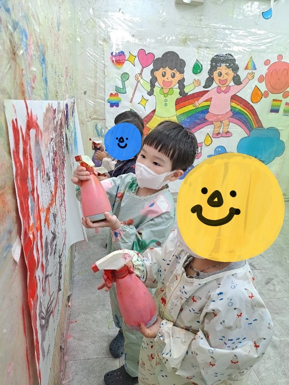 먼저, 벽에 붙여진 큰 종이에 아이들이 그림을 그렸습니다. 그리고 물뿌리개로 뿌리는 활동입니다. 그런데 사진 속 1호는 아주 진지해 보입니다. 평소 물뿌리개와 빨간색을 좋아하는 1호입니다. 역시 빨간색 그림 앞에 서서 물뿌리개를 쥐고 손에 힘을 주어 물을 뿌리는데 집중했습니다. 1호는 손에 물이 묻는 걸 싫어합니다. 그런데 열중해서 그런지 잊어버린 듯 보였습니다.