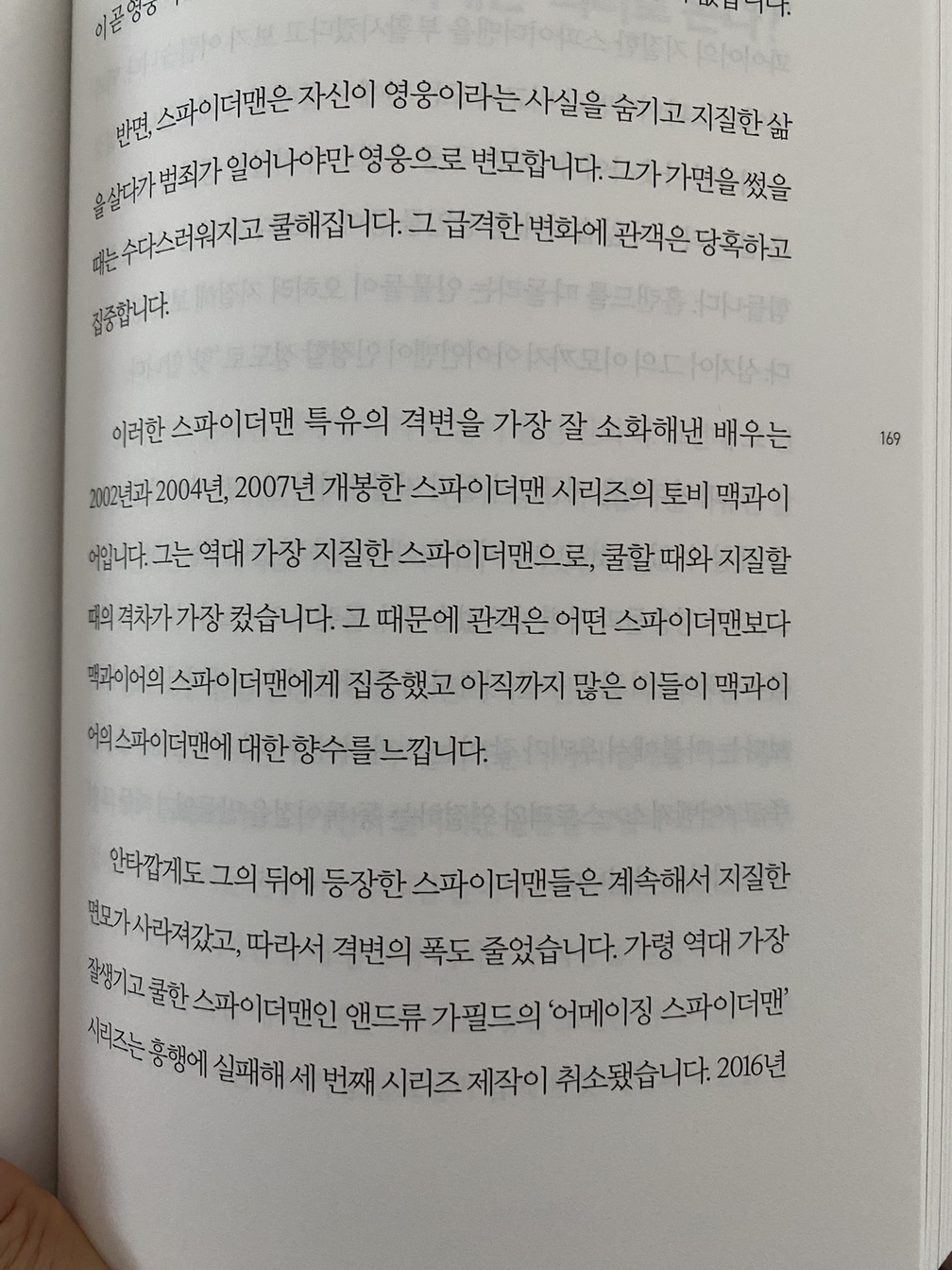 <격변>은 상황 따위가 갑자기 심하게 변함입니다. 스파이더맨이 인기를 잃은 이유가 기억에 남습니다. 스파이더맨은 거미줄을 쏘며 이 건물 저 건물을 곡예하듯이 이동하는 모습이 아주 인상적입니다. 셋째, 넷째 손가락을 접어서 끈끈한 거미줄을 발사하는 모습도 떠오르고요. 그런데 스파이더맨은 아주 오래전부터 인기가 있었지만 지금은 로다주의 아이언맨에 비해 밀리고 있는 게 사실입니다. 왜 그럴까요? 작가는 스파이더맨은 마블 히어로 중에 격변의 폭이 가장 큰 캐릭터라고 말합니다. 평소에는 지질한 삶을 살다가 범죄가 일어나면 영웅으로 변모하기 때문이죠. 그리고 가면을 썼을 때 쿨해지고 당당한 모습에 관객들은 집중하게 되는 듯합니다. 이러한 스파이더맨 캐릭터를 가장 잘 소화해 낸 배우는 바로 ‘토비 맥과이어’라고 합니다. 누굴까 하고 실제로 인물을 검색해보았습니다. 눈이 크고 동그란 외모에 제가 기억하고 있는 피터 파커였습니다. 그에 비해 다른 배우들이 스파이더맨을 연기했을 때는 흥행에 실패했다고 하는데요. 작가의 말처럼 스파이더맨이 좀 더 지질해지고 격변의 폭이 클수록 사람들이 재미를 느끼고 오래 기억에 남는 듯합니다.