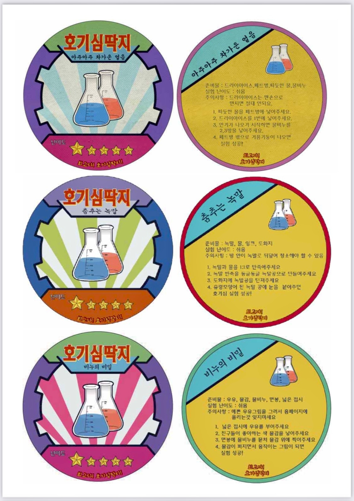 <시즌 1>은 삼각 플라스크가 그려져 있고, 아주아주 차가운 얼음, 춤추는 녹말, 비누의 비밀 등이 보입니다. 양면으로 인쇄하는 것 같은데 준비물과 실험 난이도, 주의사항들이 적혀 있는 걸 보니 실험을 위주로 다룬 시즌으로 보입니다.