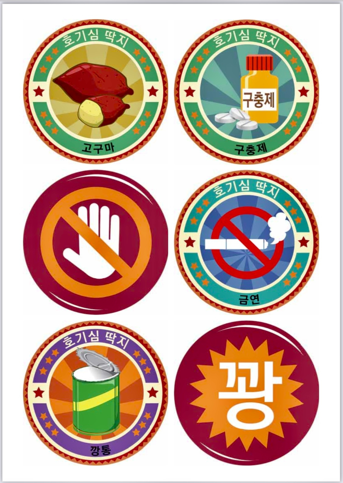 그리고 어떤 딱지인지 맞춰보는 활동을 하였습니다. 제가 매일 커피를 마셔서 그런지 커피 딱지는 바로 맞혔습니다. 독사 딱지는 뱀 딱지로 비슷하게 맞추었습니다.