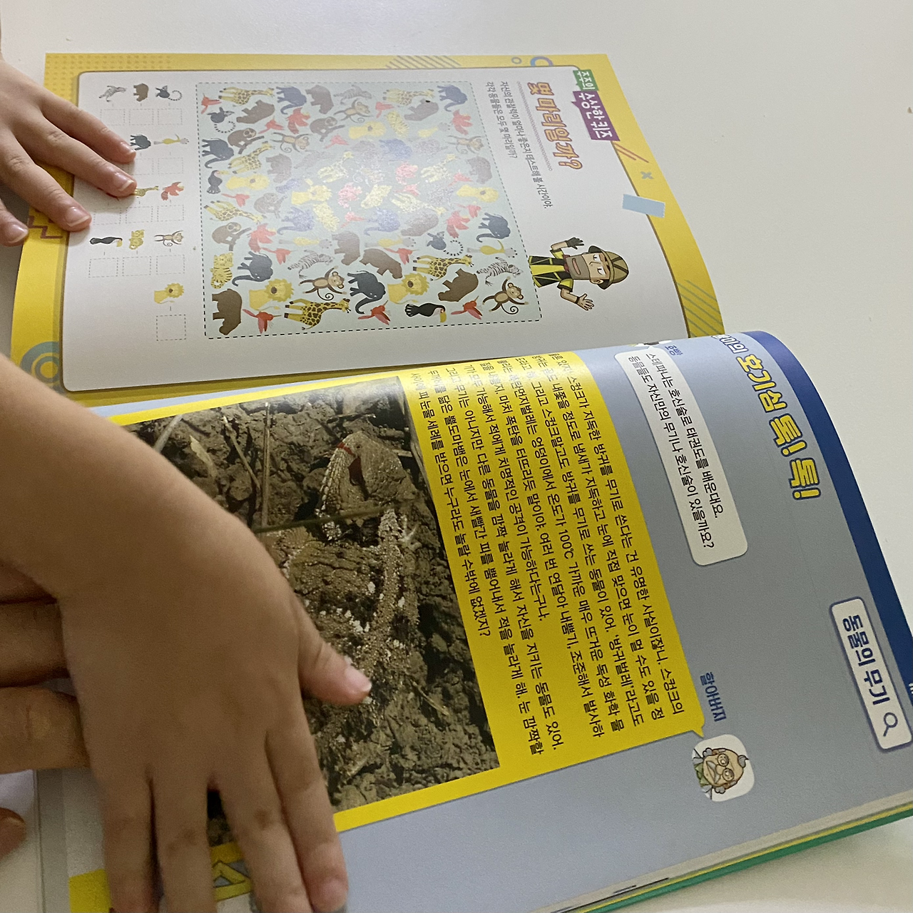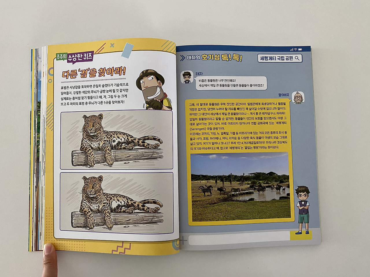 ‘주주의 수상한 퀴즈’에서는 아이들이 책 내용을 보고 재미있게 풀 수 있는 내용들이 학습지처럼 포함되어 있었습니다. 예를 들면, 다른 ‘점’을 찾아라에서 표범 두마리의 무늬에서 다른 곳을 5곳을 찾아보는 활동이 있었습니다.