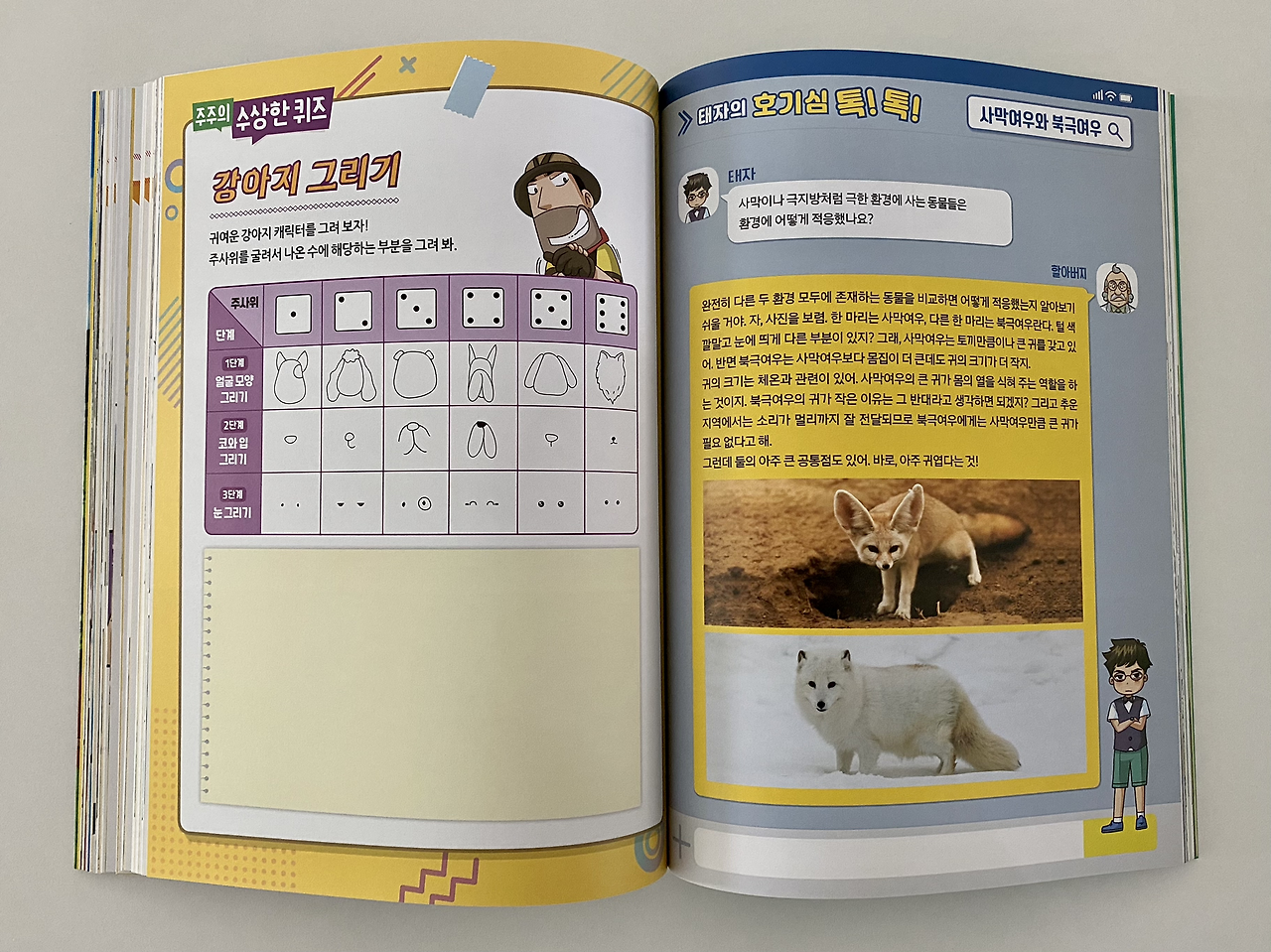 ‘호빵이의 호기심 톡!톡!’에서는 신기하고 재미있는 읽을 거리를 접할 수 있었습니다. 예를 들면 사막이나 극지방처럼 극한 환경에 사는 동물들 이야기가 나오는데 이것은 초등학교 과학교과에도 등장하는 내용입니다. 사막여우와 북극여우. 사막여우는 토끼처럼 큰 귀를 갖고 있고 북극 여우는 몸집이 크고 귀의 크기는 작습니다.