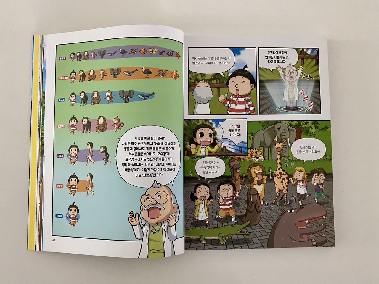 만화로 되어 있어 부담되지는 않았고 유익한 과학 상식을 많이 접할 수 있었습니다. 예를 들면, 스웨덴의 생물학자 칼 폰 린네(1707년~1778년)는 동식물을 ‘종-속-과-목-강-문-계’로 구분하였습니다. 동물은 150만 종 정도 된다고 합니다.