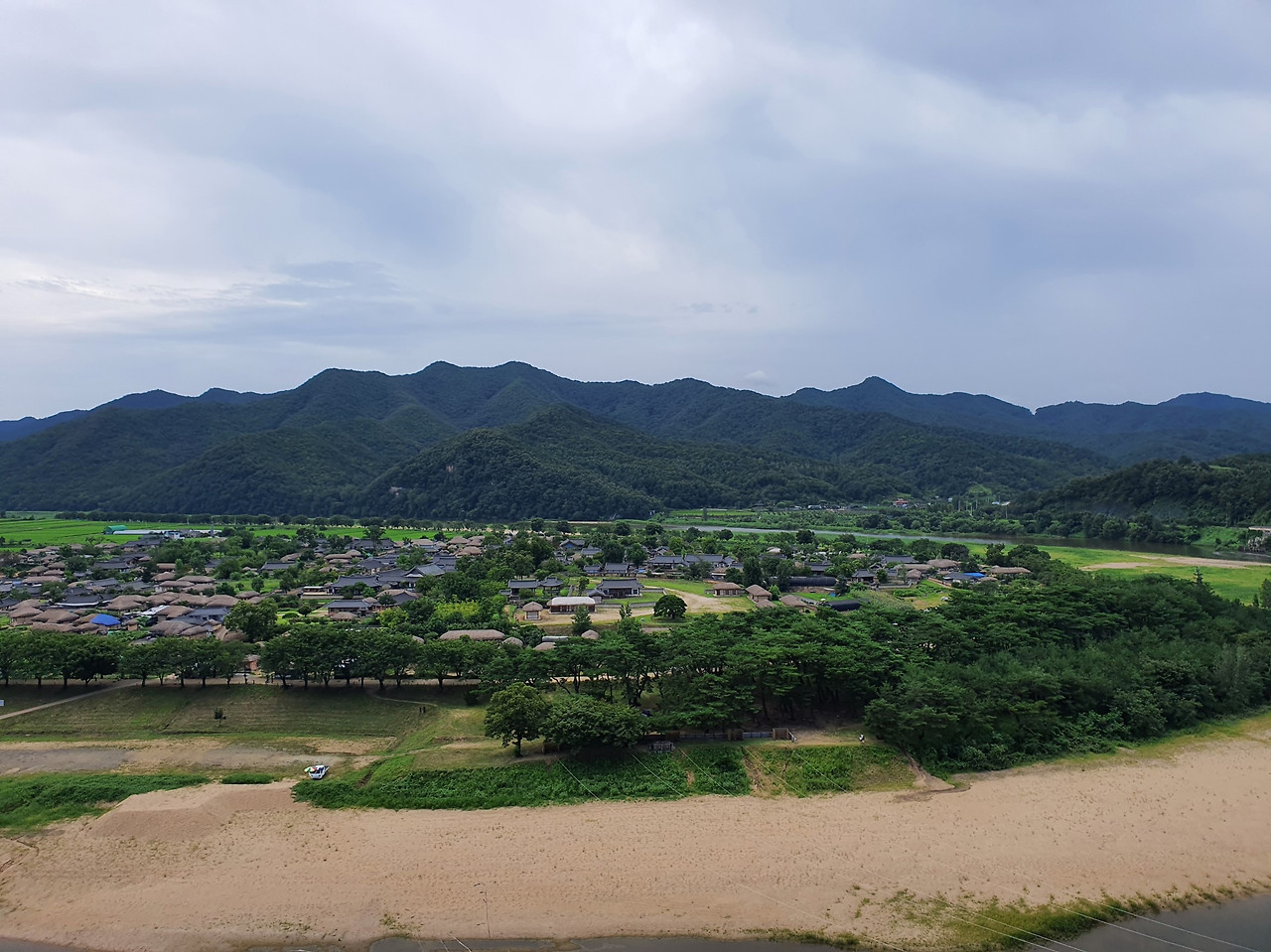 [그림 1] 부용대에서 바라다본 하회마을 전경. 낙동강이 휘어 감고 돌아가는 너른 터에 마을이 조성되어 있다.