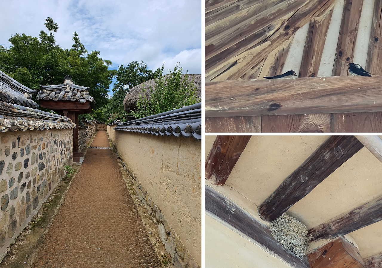 [그림 2] 하회마을의 골목길과 제비. 도시에서 볼 수 없는 멋들어진 한옥을 보는 재미가 쏠쏠하다. 긴 골목길은 왼쪽으로 돌면 삼신당 신목이 나온다.
