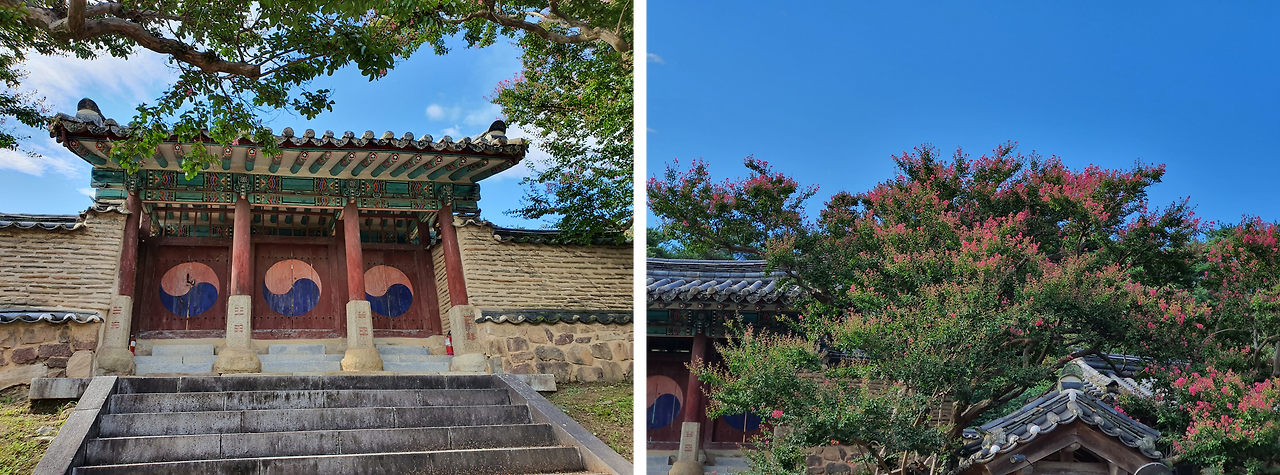 [그림 4] 병산서원 대문과 서원 둘레에서 꽃을 피운 배롱나무
