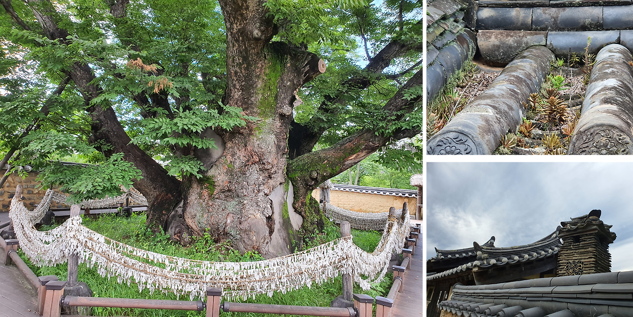 기와집 자체도 아름답지만 둘러쳐 저 있는 담장, 뒷 곁에 서 있는 굴뚝도 아름답기 그지없다. 기와의 사이 사이 골에는 작은 양분을 취하면서 와송과 잡초들이 자라고 있다. 자연과 인공이 조화롭다. 삼신당 신목 골목길의 끝을 돌아서면 삼신당 신목이 엄청난 규모를 자랑하면서 서 있다. 수령이 수백 년 된 느티나무가 마을의 당산나무이다. 사람들의 소원 기도문이 신목을 한 바퀴 돌면서 걸려있다. 사람들의 기원이 저리도 많다. 내가 살던 고향 마을에도 커다란 당산나무가 있었다. 아름드리 느티나무가 가지를 넓게 펼치고 있었는데 여름에 시원한 그늘을 선사했다. 어린 동생을 나무 아래 내려놓으면 기어 다니면서 지나가는 개미를 주워 먹곤 했는데 삼신당 신목을 보니 그때가 선하다. 나도 동생을 따라서 커다란 검은 개미의 꽁지를 빨아먹곤 했다. 개미산의 시큼한 맛이 지금도 선하다.