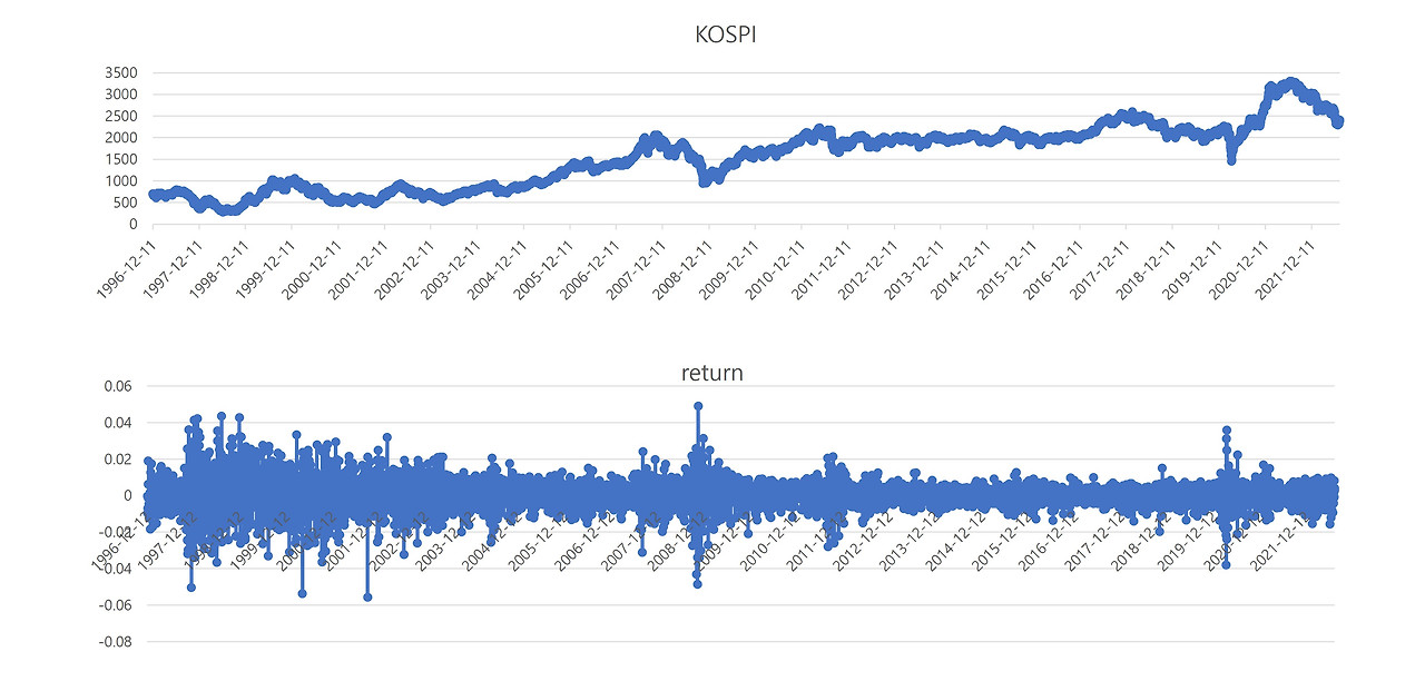 [그림] 코스피 주가지수와 로그 수익률. 수익률이 양수이면 주가지수가 올라간 것이고 음수이면 하락한 것이다.