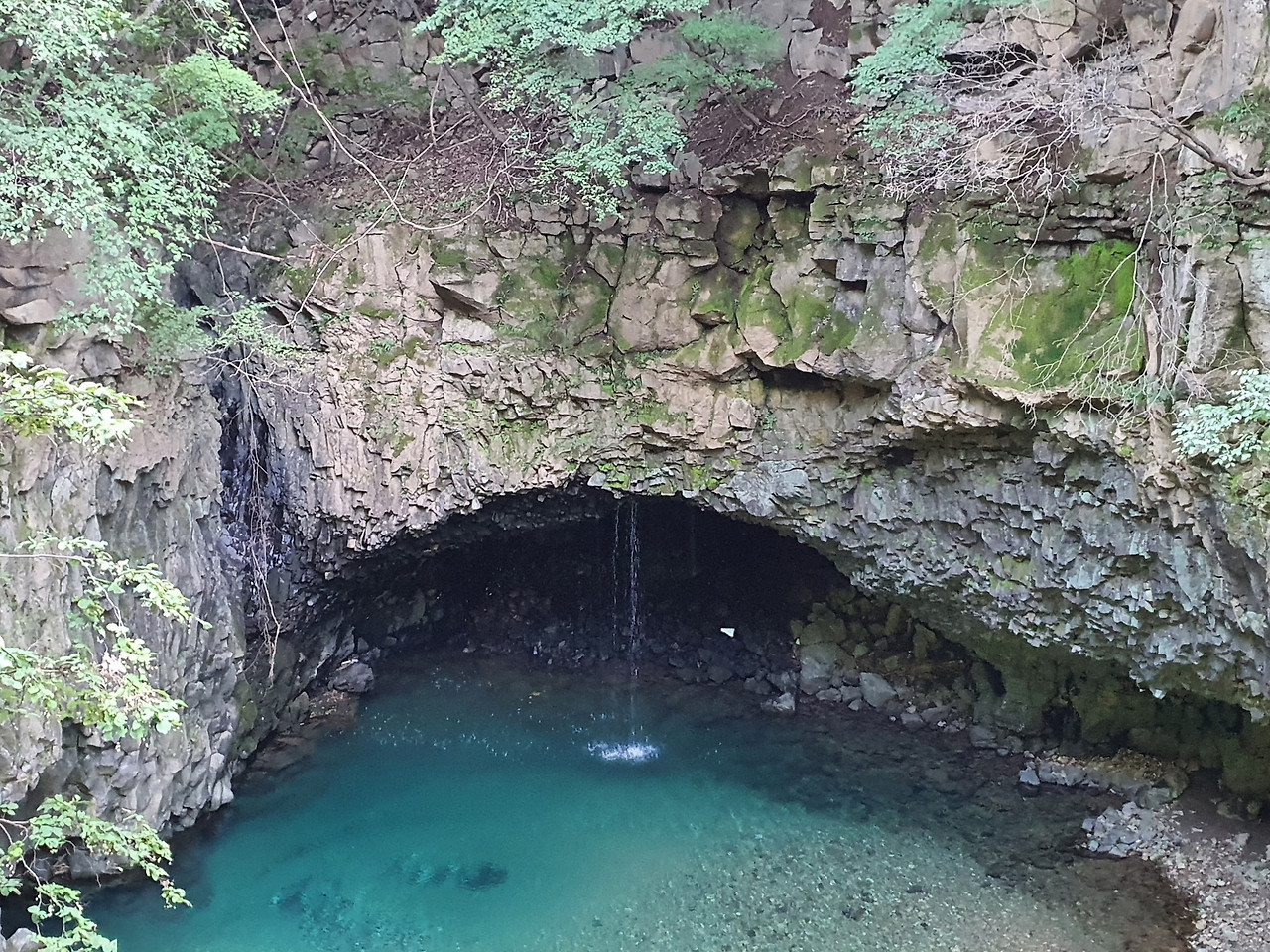 [그림 4] 비둘기낭이 이색적인 모습. 수천 년의 물 흐름이 동굴을 만들었고 드러난 주상절리를 명확히 볼 수 있다. 천장에서 떨어지는 물줄기는 어디에서도 볼 수 없는 관경이다.