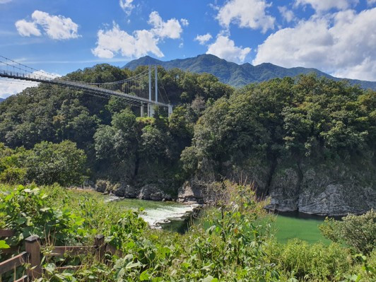 전망대에서 조금 더 걸으니 부소천교 이다. 부소천교 못 미쳐 둘레길 옆에 멍우리 협곡 캠핑장이 있다. 캠핑장 옆에 밤나무와 도토리나무가 많고 밤이 길가에 많이 떨어져 있지만 관심이 있는 사람이 없다. 지난여름의 폭우에 부소천교 근처에 있다던 징검다리 길은 온 데 간데없고, 강변을 따라 나 있어야 하는 잔도도 보이지 않는다. 우리는 밤나무에 정신이 팔려 걷는데 지장이 있어서 부소천 지나 부소천 협곡 길을 걸어보려 했으나 포기하고 원점으로 되돌아왔다. 주차장 옆에서 주전부리 파는 푸드트럭들이 진을 치고 있지만 사람이 거의 없다. 와플 한쪽과 아이스크림을 하나 사 먹고 출렁다리인 하늘다리를 걸어 본다. 출렁다리는 높이가 장난이 아니다. 아래를 바라보니 다리가 후들후들 한다. 더구나 한탄강 여울에 흰 물보라가 생기는 지점이 정확히 보이는 지점에 투명 유리로 아래를 볼 수 있게 하였다. 빠르게 흐르던 물에 낙차가 생기는 지점에서 여울이 형성되어 있고 그 흰 물보라는 다른 데서 볼 수 없는 관경이다. 하늘다리에서 한탄강의 상류와 하류를 조망할 수 있어 좋다. 다리에서 멀지 않은 하류 왼쪽에 비둘기낭이 있는 곳이 보인다. 마지막에 보려고 아껴 두었던 비둘기낭으로 발길을 돌린다.