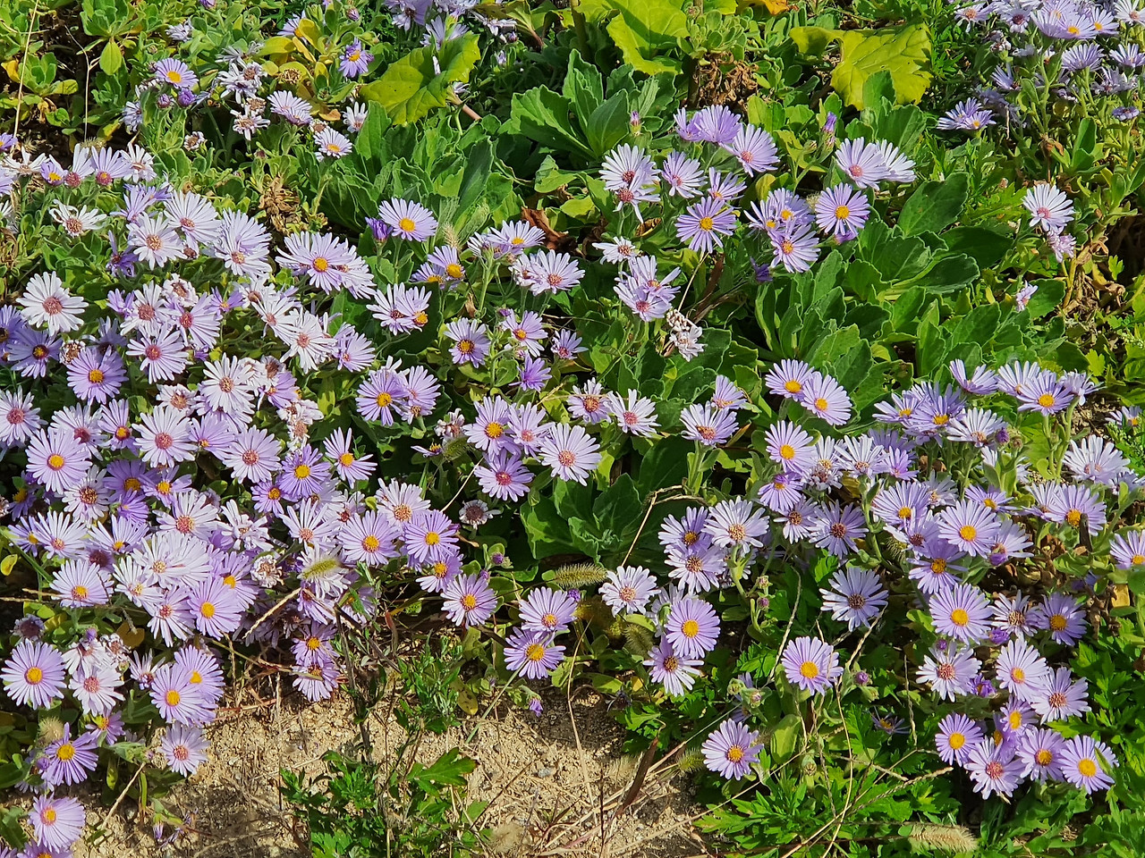이기대를 지나 수평선이 보이지 않는 남해를 보면서 걷는다. 해안길을 여러 명이 단체로 걷기도 하고 홀로 걷는다. 혼자 또는 둘이 걷는 외국인들도 더러 보인다. 해안길 주변에 가을꽃이 지천으로 피어있다. 바닷가에서 볼 수 있는 해국이 군데군데 군락을 이루어 펴 있다. 구절초나 벌개미취와 꽃 모양이 비슷하지만 입사귀의 모양이 아주 다르다.