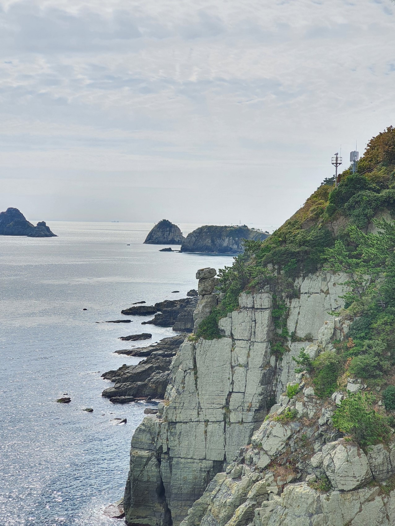 여러 번 오르막길을 오르니 농바위가 보인다. 머리에 모자를 쓰고 있는 사람 형상의 바위가 벼랑 끝에 아슬아슬하게 서 있다. 풍상이 만들어낸 걸작일 것이다. 예전에 해녀들이 이 바위를 좌표 삼아 물질을 했다고 한다. 농바위 고개를 돌아서면 이기대길의 끝이 아닐까 하고 기대했지만 한 번 더 가파른 계단길을 올라야 한다. 두 시간 정도를 걸어서 드디어 오륙도가 보인다. 오륙도가 보이는 절벽 아래에 사람 손이 미치지 못하는 곳에 보랏빛의 해국과 노란색의 털머위 꽃이 서로 경쟁하듯 피어 있어 조화롭다. 오륙도가 내려다 보이는 언덕 위에서 시원하게 펼쳐진 바다와 점점이 떠 있는 오륙도를 한가롭게 감상한다. 이기대 길은 두 번째 걸어 보지만 부산 해안길의 참맛을 느낄 수 있는 둘레길이다. 다음에는 오륙도에서 용호만까지 반대로 걸어보고 싶다.