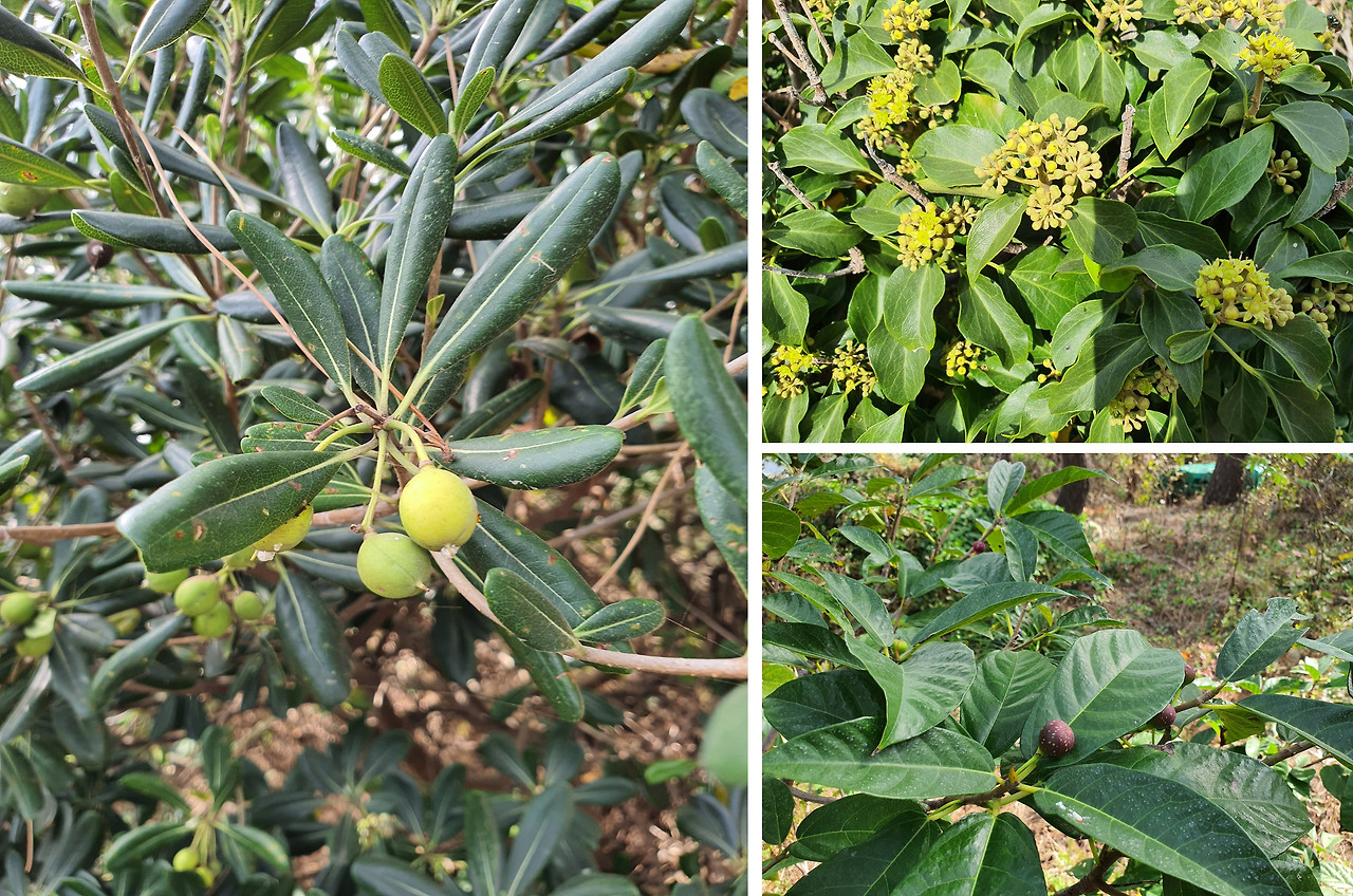 [그림 5] 열매를 달고 있는 돈나무, 송악 넝쿨의 열매가 마치 부처님 머리 같다. 천선과나무의 열매는 꼭 커피 열매처럼 생겼다.
