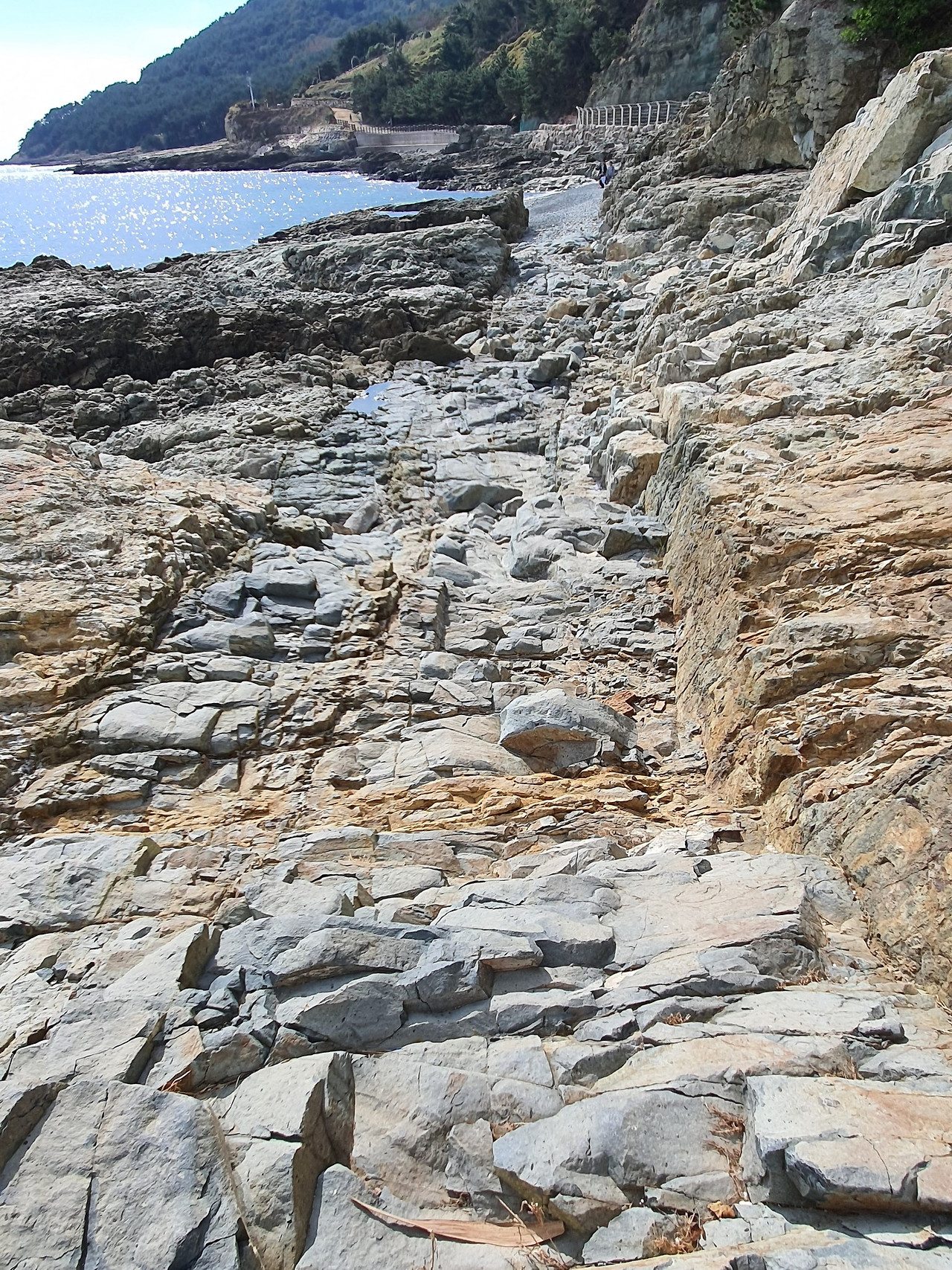[그림 2] 이기대 근처에서 볼 수 있는 함각섬석 암맥. 가운데 밝은 색 부분이 각섬석으로 양옆의 암석과 다르다.