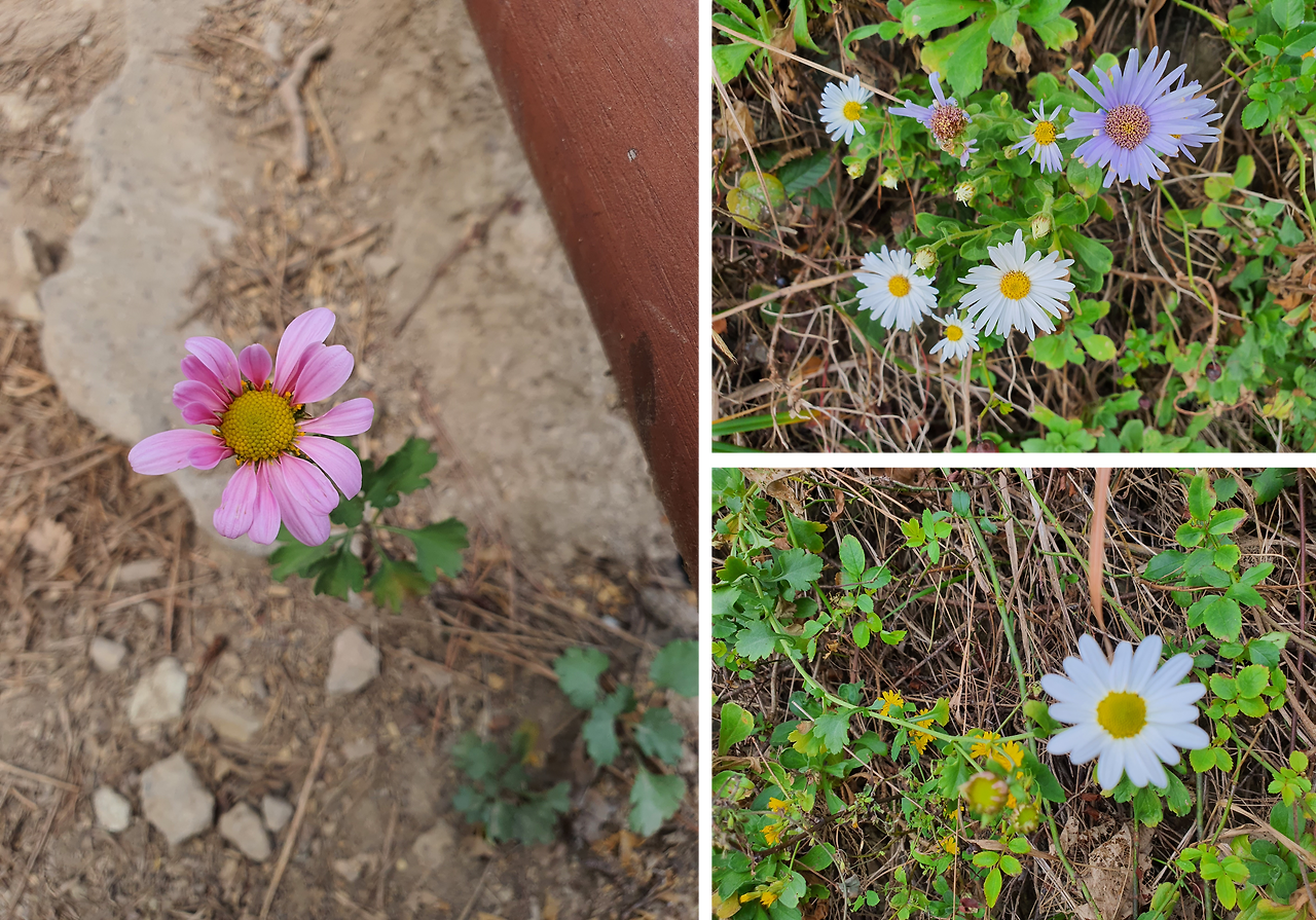 [그림 4] 해국과 구절초. 흰색 구절초와 해국이 함께 피어 있다. 분홍색 구절초가 돌 틈에서 외롭다.