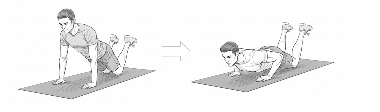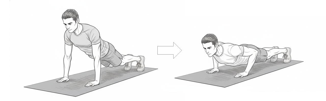 1. <니 푸시업> 자세에서 무릎을 떼고 발가락과 양손으로 체중을 지탱합니다.