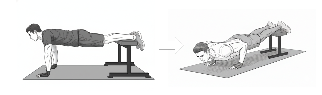 팔과 어깨 그리고 가슴에 주어지는 긴장도를 높이고 운동 효과를 극대화하기 위한 푸시업 방법입니다. 발을 소파나 의자 위에 올리고 손을 바닥에 짚습니다. 체중이 상체로 쏠려 강도가 높아지며, 처지기 쉬운 윗가슴을 공략해 굽은 어깨를 펴는 데에 효과가 큽니다.