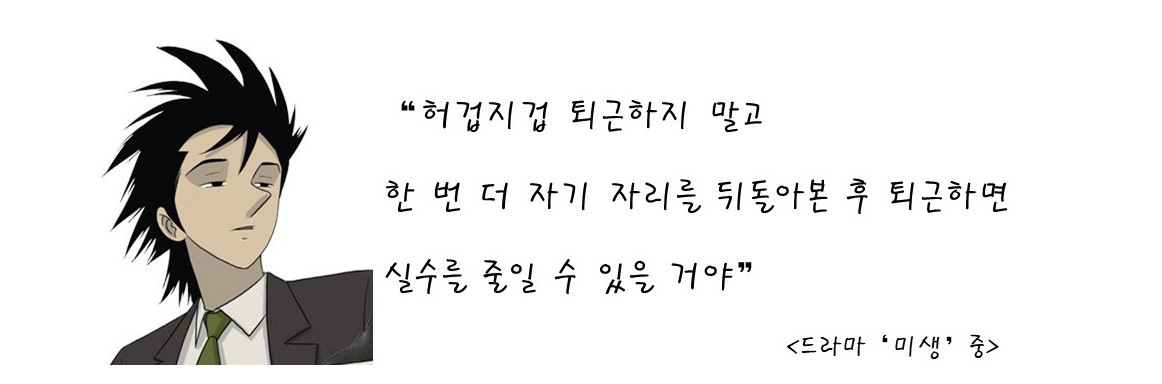 이는 제가 직접 겪은 경험들이 쌓여서 내뱉어진 말입니다. 직장 곳곳에서 나를 지켜보는 눈들이 있습니다. 자신을 돌아보고 정리하며 깔끔한 모습을 보여주세요. 꼭 다른 사람에게 깔끔한 이미지를 남기기 위해서라기보다는 스스로 정리하고 보다 건강한 직장생활을 위해..