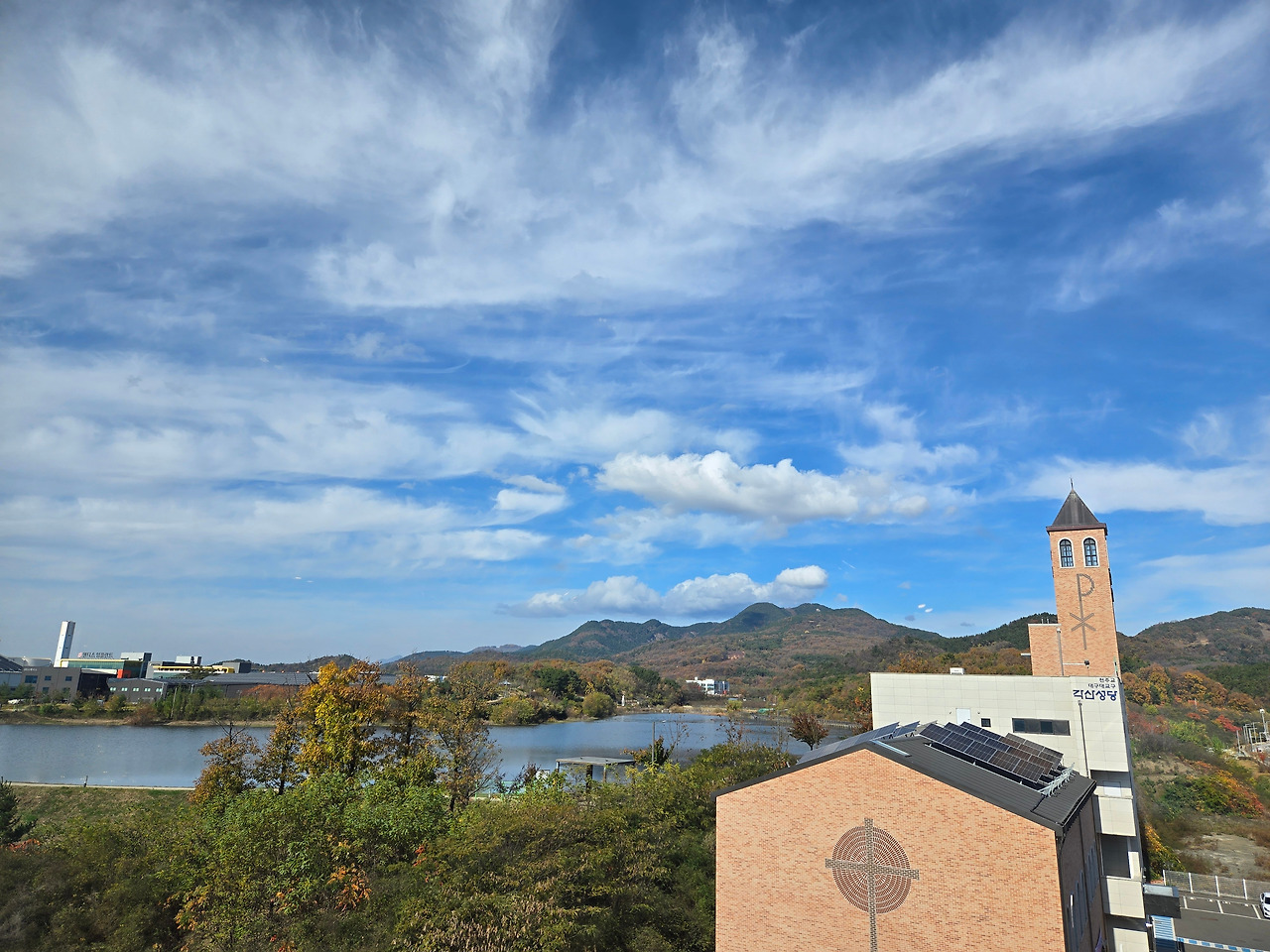 카페 뷰가 너무 좋았다. 호수와 구름이 보이는 풍경이 일상에서 주는 스트레스를 풀어주었다. 스트레스 많다기보다는 매일 똑같은 일상이 주는 지루함에 자연의 아름다운을 만끽할 수 있어 눈과 머리와 가슴의 풍요를 주었다. 더욱이 아무것도 하지 않고 도란도란 친구들의 이야기를 들으며 마냥 행복했다.