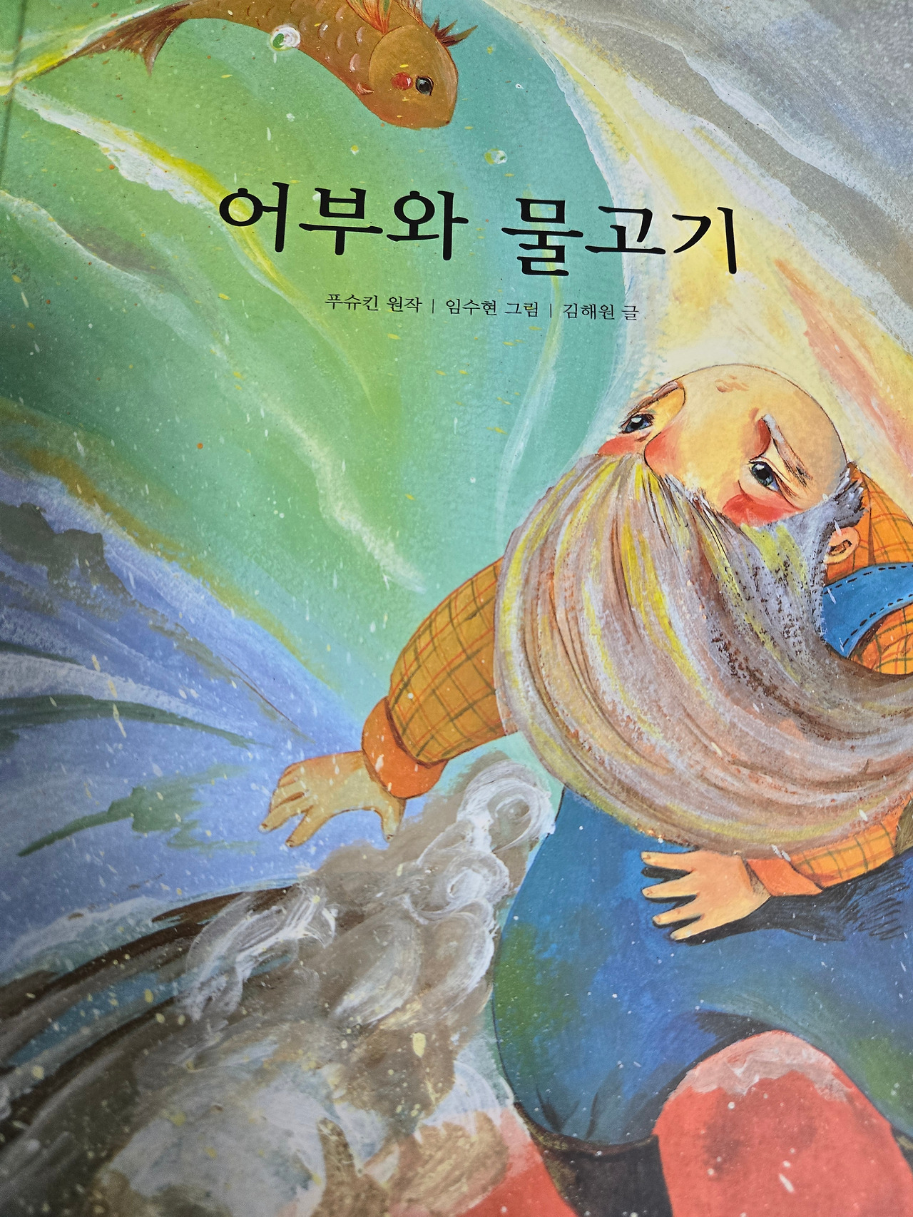 (어부와 물고기) 그림동화는 할아버지와 할머니는 바닷가에서 물고기를 잡아 생활하고 있었지요. 어느 날 황금빛 물고기를 잡았고 놓아주면 소원을 들어준다는 것이다. 할아버지는 불쌍해서 놓아주었다는 말에 할머니는 화를 내며 바닷가에 가서 소원을 말하라고 하여 깨진 빨래통을 새것으로, 큰집으로, 여왕으로.... 결국 욕심으로 인해 원래의 삶으로 돌아왔다는 내용이다.
