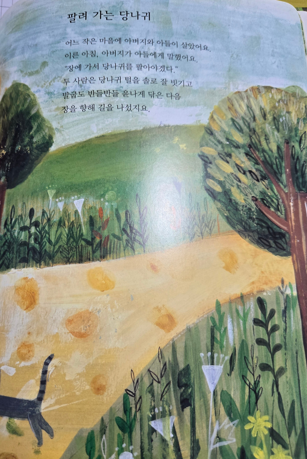 어느 날 아들과 아버지는 당나귀를 팔려 가려고 고삐를 잡고 걸어가는데 장사꾼이 "저 바보 보게 당나귀를 타고 가지 않고 끌고 가지." 그 말을 들은 아버지를 당나귀에 아들을 태워 갔더니 노인들이 "버르장머리 없는 아이로군" 그 말을 듣고 아들을 내리고 아버지가 당나귀를 타고 가자 아주머니들은 "어린 아들을 걷게 하다니 "..... 사람들의 이야기를 듣고 듣고 듣다가 결국 당나귀를 개울에 빠뜨리고 말았다는 이야기랍니다.