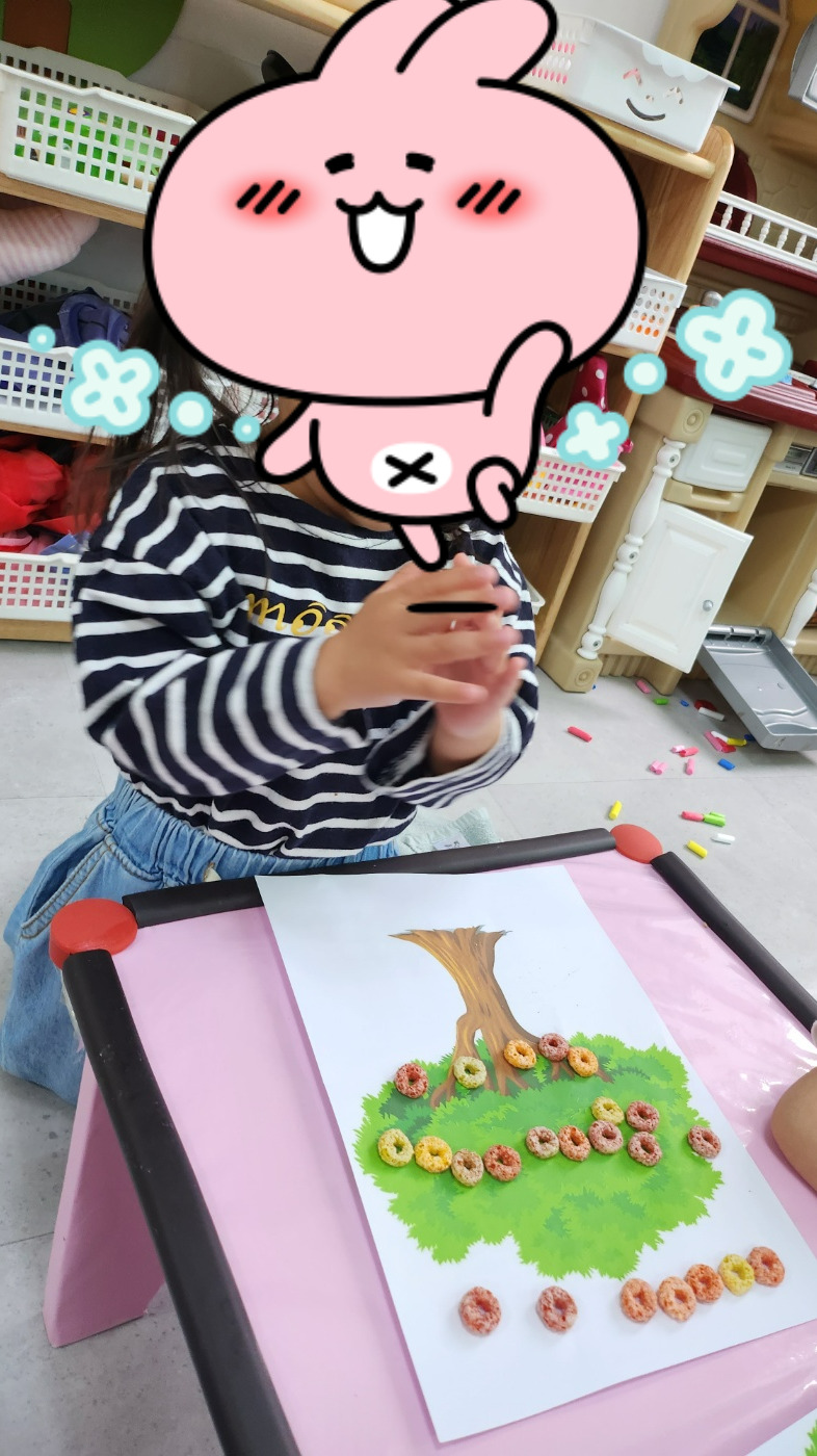 나무가 프린트 된 종이 위에 열매(동그라미 모양에 색깔이 알록달록한 시리얼) 꾸미기도 했었는데 다들 스타일이 나옵니다.