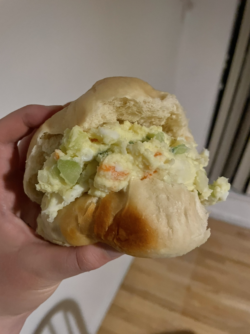 주말 내내 계속 감자사라다빵이 먹고 싶었다. 하지만 여기는 외국의 소도시. 이런 메뉴는 사 먹을 곳이 없다. 별 수 없다, 내가 만드는 수밖에. 게다가 집에는 처치곤란 싹 난 감자들이 있었다. 유기농 오이 연쇄살인마(냉장고에서 자꾸 썩힘)인 내가 이번엔 꼭 다 소비할 거라며 마음먹고 산 유기농 오이들도 있었다. 당근도 있고... 그래서 만들었다, 감자사라다빵! 그리고 만들자마자 빵에 올려 와구와구 먹었다. 밤 11시가 넘은 시각이었던 것 같다. 바쁜 평일 낮을 솔로 육아를 대비한 내 나름의 처방이었다. 설탕, 소금, 마요네즈를 더 넣었으면 더 맛있었겠지만, 그냥 적절히 달고 적절히 짜고 적절히 퍽퍽한 저 상태도 맛있어서 최고의 맛은 포기했다. 이미 반은 내가 오늘 아침, 점심까지 먹어서 없애버렸다.