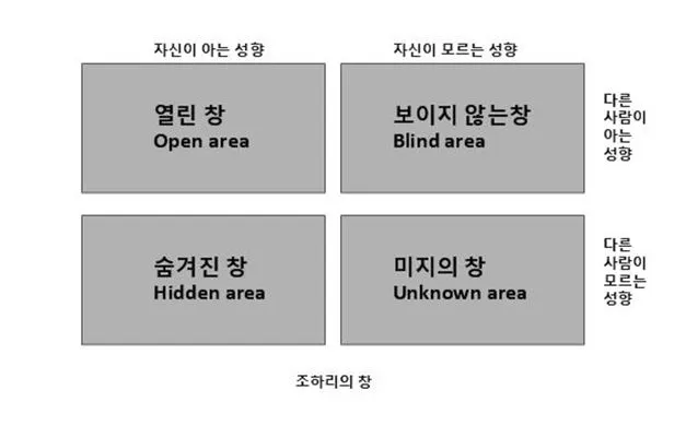 [24] 러프트(Joseph Luft)와 해리 잉햄(Harry Ingham)이 공동 집필한 논문에 게재한 ‘조하리 창’ 이론은 타인과 자신과의 관계를 통해 어떻게 관계를 개선할지를 보여주는 분석도구이다.