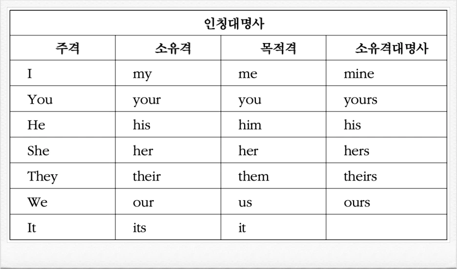 관사는 품사에 속하지는 않는다. 소유격은 인칭대명사이다. 관사와 소유격은 명사를 꾸며준다. 그렇기에 품사에 속하지 않는 관사와 소유격을 기억했으면 한다. 소유격은 한국인이 중학교에 입학하면 죽어라 공부하는 인칭대명사 중 하나이다.