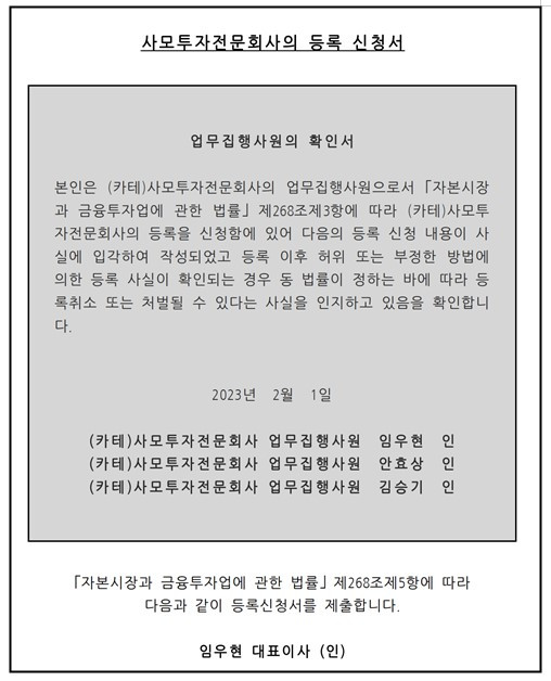 “금융감독원에서 배포한 ‘경영참여형 사모집합투자기구 실무안내’를 참조했어. 물론 대부분 과정을 아버지가 도와줘. 그래도 쉽지가 않아. 하지만, 미래가 확실하니까 정말로 즐겁다. 이게 다 너희들하고 잘 먹고 잘살려고 하는 행동이다. 나중에 정말 고마워해야 한다. 알았지? 아, 그리고 무한책임사원으로 등록하려면 서류가 좀 많아. 지금 알려줄게. 둘 다 준비해서 바로 보내줘.”