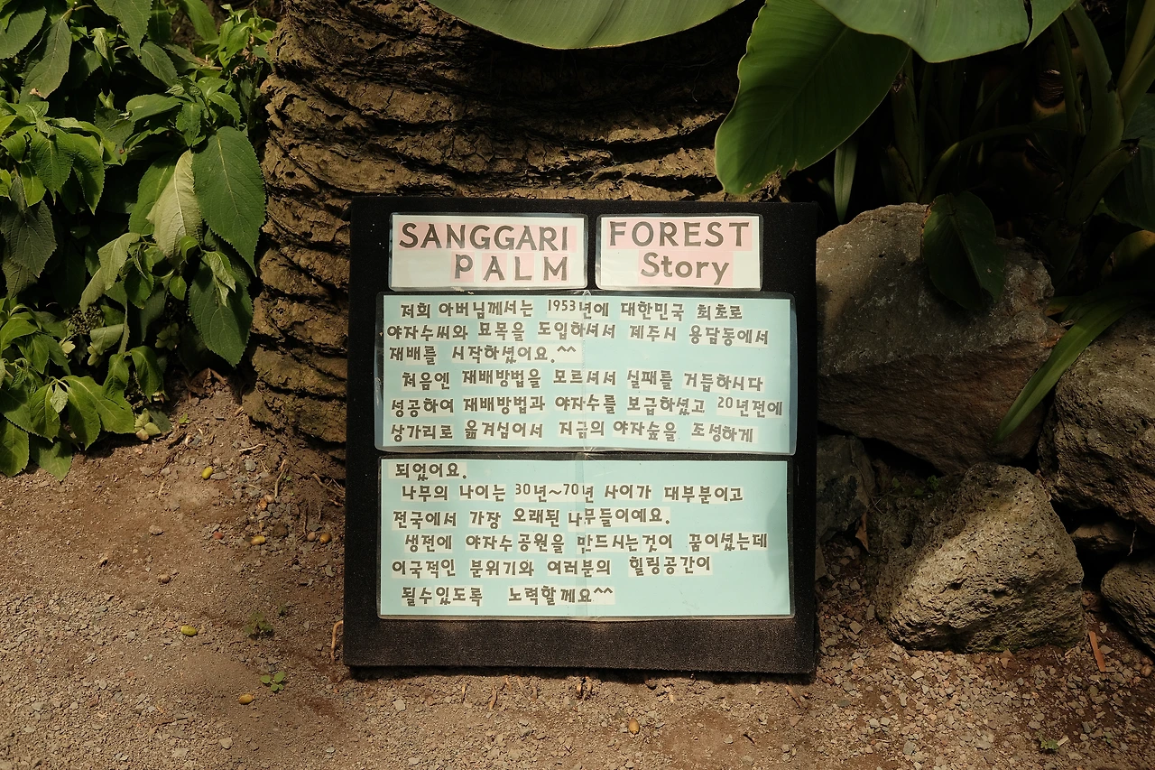 저희 아버님께서는 1953년에 대한민국 최초로 야자수씨와 묘목을 도입하셔서 제주시 용담동에서 재배를 시작하셨어요. 처음엔 재배방법을 모르셔서 실패를 거듭하시다 성공하여 재배방법과 야자수를 보급하셨고, 20년 전에 상가리로 옮겨심어서 지금의 야자숲을 조성하게 되었어요.