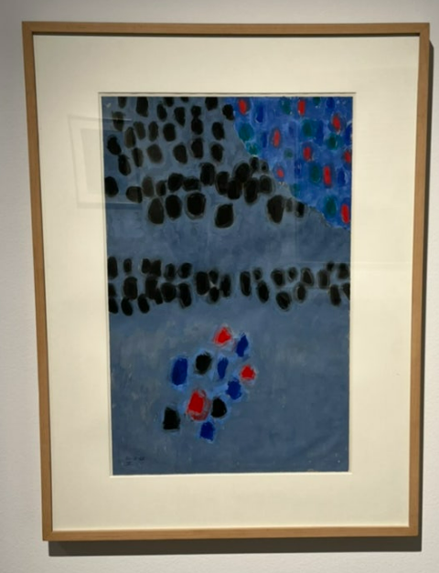작가님의 뉴욕시대 작품은 거의 완전한 추상을 향해 가는 과정이어서 점, 선,색의 순수한 형태들이 돋보였다. 그림을 보다가 내 눈을 끈 점묘화가 보였다. 어린 시절 냇가에서 보았던 올챙이 알이 떠올랐다. 톡톡 터질 것 같은 알들, 우무질에 쌓여서 미끈거리는 알을 잡고 싶어했단 개구쟁이 내 어린시절을 마주한다.