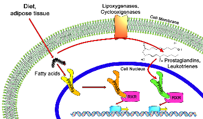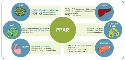 핵호르몬 수용체로써 여러 유전자들의 발현을 조절. 특히 PPAR-α는 근육이나 간세포에 존재하고 지질 대사를 조절