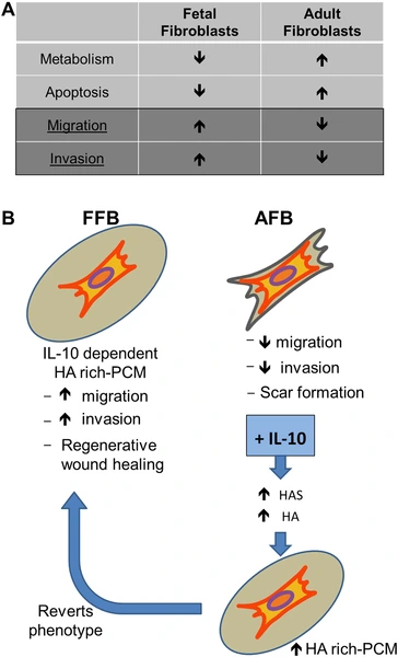 성인 섬유아세포와 달리 상처를 흉터 없이 치료할 수 있는 특성을 가지고 있으며 치료보다는 재생을 일으키는 기전을 가지고 있다.