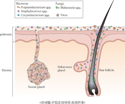 피부상재균 : 피부에 있는 세균총으로 주로 표피 포도상구균과 황색포도구균, 화농연쇄구균, 여드름균, 말라쎄지아 등이 있음