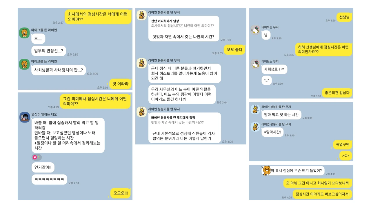 문득 점심을 드시지 않는 분들이 계신걸 보고 누군가에게는 점심시간의 의미가 휴식(휴게시간)이 아닐 수도 있다는 걸 알게되었습니다. 그래서 사회초년생인 친구들에게 물어봤습니다, "너에게 점심시간은 어떤 의미야?"