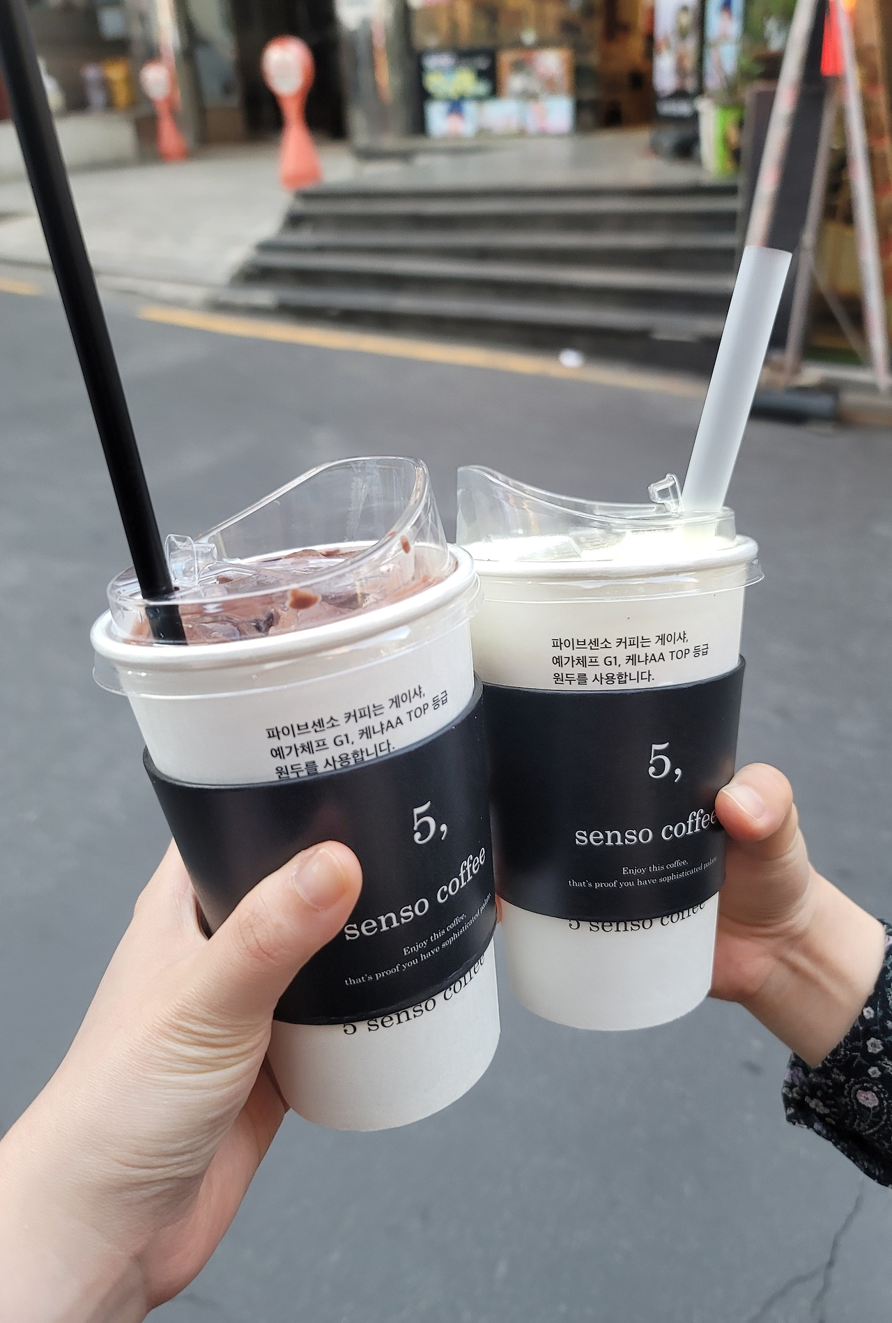 예견된 야근하는 날 하늘은 맑고 커피도 맛있었습니다. 철저히 의도적으로 카페에 있는 말랑말랑 복숭아의 치명적인 뒤태를 보러 가곤 합니다. (야근메이트 저희 주임님과 5센소커피)