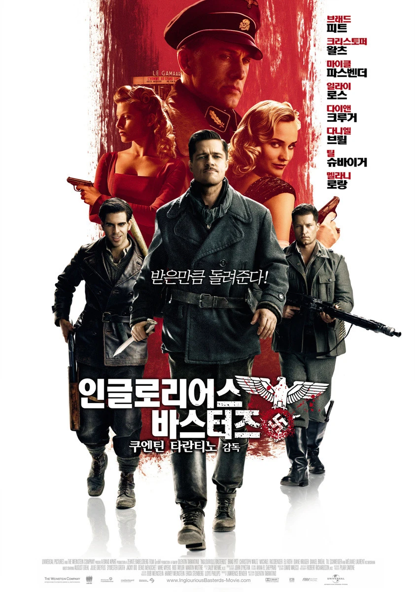 소개. 독일이 무차별적으로 유대인을 학살하던 2차 세계 대전 시기, 나치의 잔인하고 폭력적인 행태에 분개한 유대인 출신의 미군 알도 레인 중위(브래드 피트)는 ‘당한 만큼 돌려준다!’는 강렬한 신념으로 그와 뜻을 함께 하는 사람들을 모아 ‘개떼들’이라는 조직을 만든다. 각각의 분야에서 재능을 가진 조직원들을 모은 알도 레인은 나치가 점령한 프랑스의 한 작은 마을에 위장 잠입해 당한 것에 몇 배에 달하는 피의 복수극을 시작하는데…