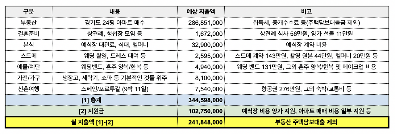 우리는 결혼과 동시에 아파트를 매수했기 때문에, 남들보다 부동산에 투입된 비용이 압도적으로 많다. 사실 예식 준비나 스드메, 예물 등은 부차적인 부분으로 생각하고 무엇보다 아파트 매수에 온 정신을 집중했던 것 같다.