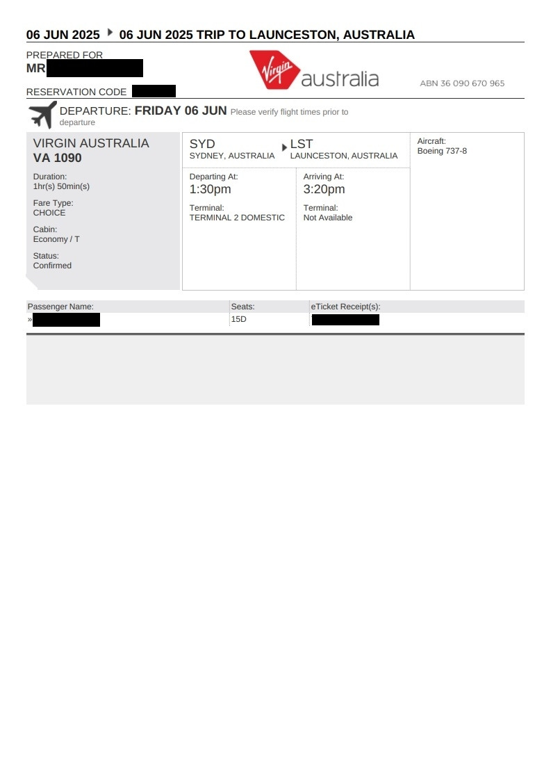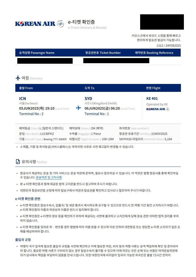 필자의 경우 대한항공으로 인천-시드니, Virgin Australia 항공으로 시드니-론서스턴 항공권을 예매하였다. 이때 반드시 각 비행 예정간 수하물 제한이 얼마나 되는지 확인하고, 상황에 맞게 예매하기를 바란다.