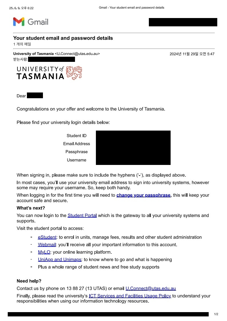 Offer를 수락하고 얼마 지나지 않아 Student Portal에 접속할 수 있는 ID와 비밀번호를 이메일로 수령하게 된다.