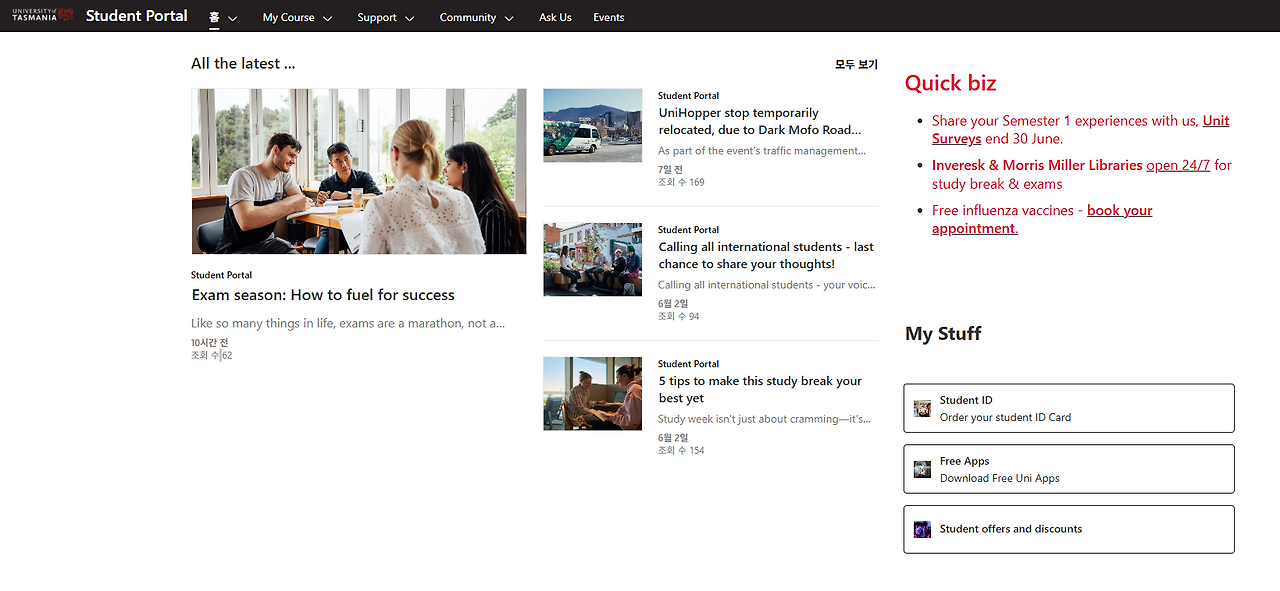 Student Portal에 접속하면 우측 아래의 My Stuff에서 Student ID 항목을 확인할 수 있다.