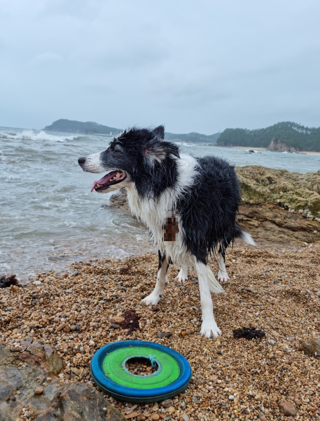 설렘 반, 걱정 반이었다. 파도가 계속 치는 해변에서 원반을 던졌다. 파도가 세서 성산이가 무작정 들어갈까 봐 마음이 조마조마했다. 바다는 처음이라 마음껏 즐기진 못했지만, 원반을 척척 물어오는 모습이 대견했다.
