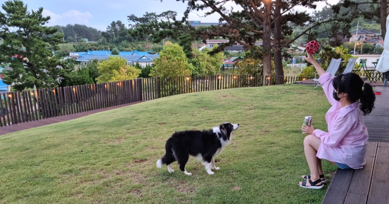 숙소의 잔디밭은 아무도 없어, 우리만의 놀이터가 되었다. 공을 물고 달려오는 성산이의 모습은 몇 번을 봐도 질리지 않았다. 오랜 시간 차를 타고 왔는데도 낯선 공간에서 잘 놀고 잘 쉬는 모습을 보니, 오히려 내가 치유되는 기분이었다.