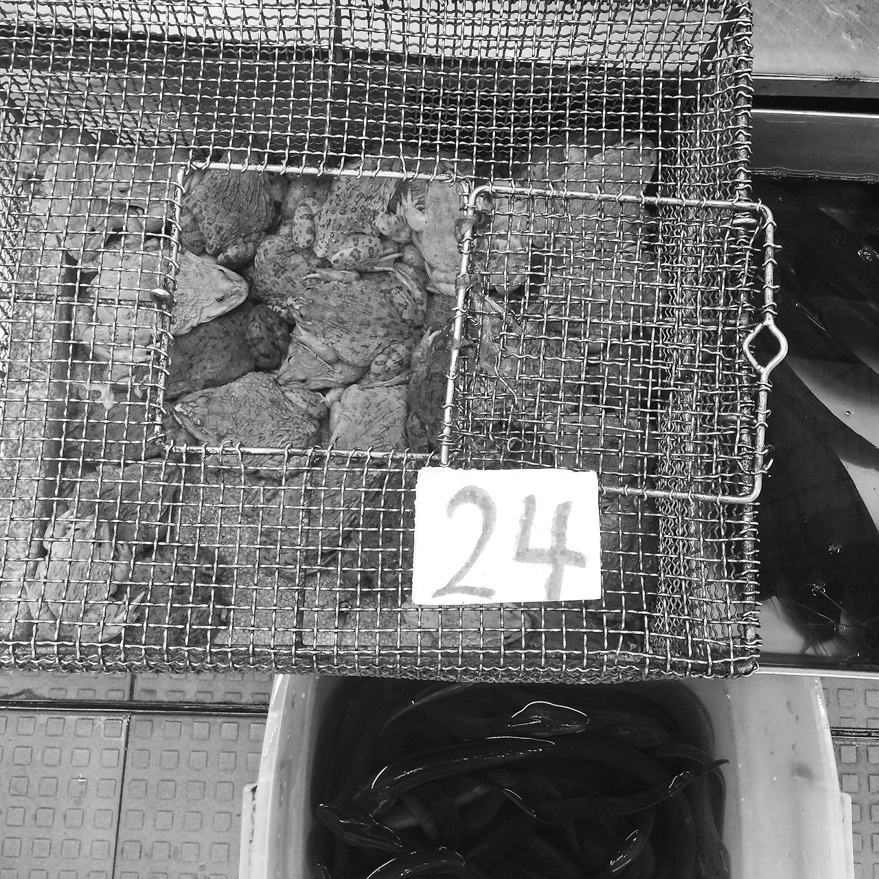 잰걸음으로 정육점을 벗어나서 마켓 빌딩 안으로 뛰어들었다. 생선 비린내와 락스 냄새가 뒤섞여 후각을 자극했다. 빌딩 안은 냉방으로 이미 시원한 데다 지천으로 깔린 얼음덩이 때문인지 서늘하기까지 했다. 수산시장이었다. 늘어선 매대 위에는 이름 모를 생선들이 잘게 부서진 얼음을 요처럼 깔고 가지런히 누워있었다. 턱 밖으로 튀어나온 이빨이 사나워 보이거나 색이 화려한, 한눈에 봐도 남국의 정취가 느껴지는 이국적인 어종들이 이곳이 노량진 수산 시장이 아니라는 사실을 상기시켜주었다. 수산시장이 있는 층은 꽤 흥미로웠다. 각종 생선들은 물론이고 신선한 패류, 난생처음 보는 커다란 갑오징어, 흡사 뒤집어진 바퀴벌레 같은 생김의 새우인지 가재인지 모를 갑각류, 철장 안에 갇혀 있는 살아있는 두꺼비 무더기와 붉은 귀 거북이나 자라는 오래전부터 축적된 살육의 흔적들과 공존해 있어 다시 한번 날 기겁하게 만들었다. 누군가에게는 사랑과 기원이 담긴 보양식 재료에 지나지 않겠지만, 나에겐 충격과 공포 그 자체였다. 기껏 살덩이들을 피해 왔더니 이번에는 두꺼비와 자라가 나를 조롱하고 있는 것만 같았다.