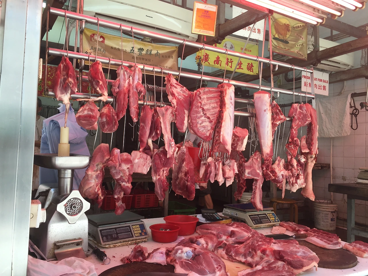 어느 정도 시간이 흐른 뒤에 나를 이토록 불편하고 긴장하게 만든 주범을 알아차렸다. 그것은 다름 아닌 초입부터 보이는 정육점이었다. 나에게 나도 모르는 공포증이 있었나? 일테면 피 나 살덩이 같은? 홍콩의 재래시장에서는 익숙한 풍경이지만 나는 늘 외면하고 싶은 게 바로 정육점 풍경이었던 게다. 보다 신선하게 보이기 위해 켠 붉은 전등 아래는 부위별로 분해된 고기들이 갈고리에 끼워져 공중부양한 채 일렬로 걸려 있다. 대부분의 고기들이 냉장고 안에 들어있거나 이미 손질된 상태로 개별 포장되어 있는 우리네 방식과는 확실히 다른 진열 방식이었다. 희대의 살인마가 광기에 차서 인육을 전시한다면 바로 그와 같은 방식일 거라는 생각이 들었다. 그나마 다행인 것은 전염병 사스가 창궐하기 전에는 정육점에서 살아있는 닭이 직접 거래되고 눈앞에서 신선하게(?) 닭의 목을 쳐주었다는 사실이다. 천만다행으로 지금은 볼 수 없는 풍경이다.