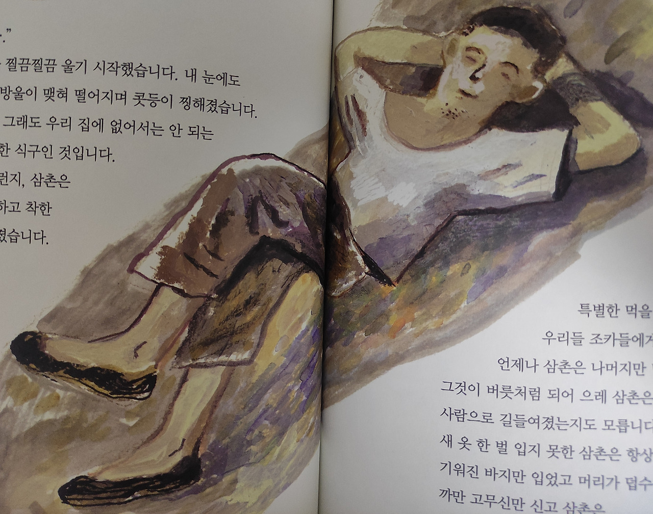 내 눈에도 갑자기 눈물방울이 맺혀 떨어지며 콧등이 찡해졌습니다.... 바보여서 그런지, 삼촌은 새처럼 깨끗하고 착한 마음씨를 가졌습니다.