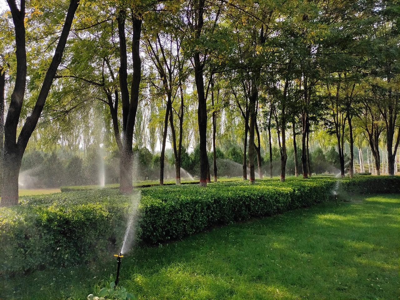 도시의 정원을 가꾸기 위해 하루종일 스프링쿨러로 물을 뿌린다
