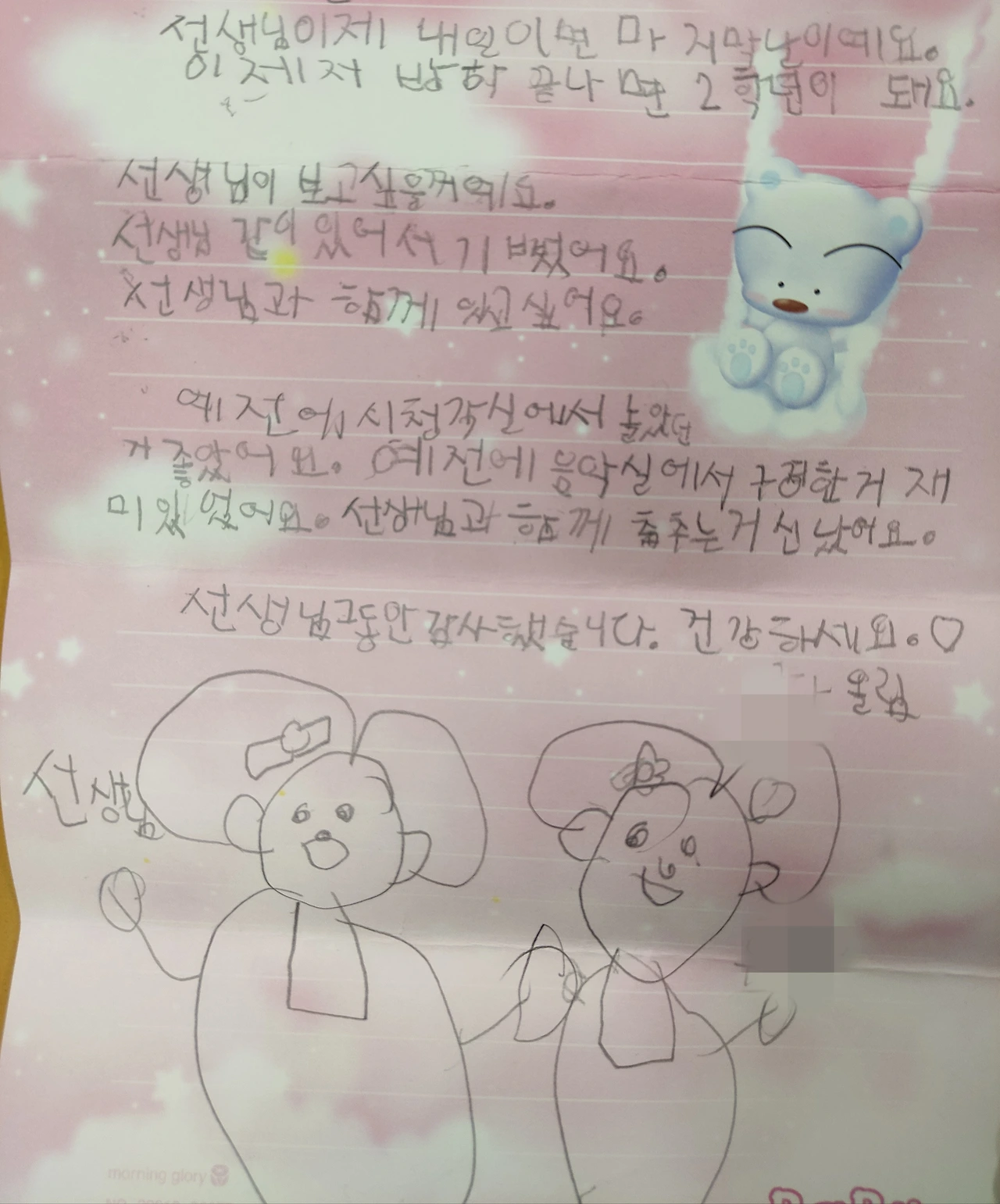 노래를 배울 때면 리듬에 흠뻑 빠져 칠판 앞에서 나뭇잎처럼 자유롭게 춤추던 달이. 테두리 안에 들어가는 법이 없던 거친 화풍도 참 인상적이었. 이제 2학년 언니가 되었을 텐데 잘하고 있으려나. 2학년 새 선생님도 눈물 많고 웃음 많고 (화도 많은) 우리 달이를 사랑해 주실까. 달이가 보고 싶다. 연가라도 내서 이전 학교 2학년 교실 앞을 서성여라도 볼까.